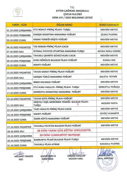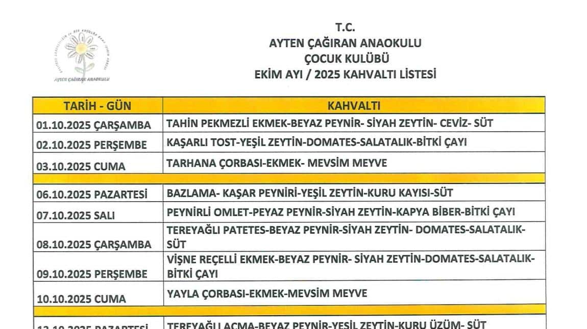 2025-2026 Eğitim-Öğretim Yılı Ekim Ayı Kahvaltı ve Çocuk Kulübü Beslenme Listesi