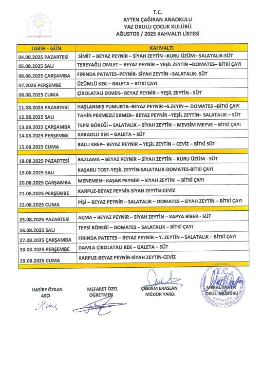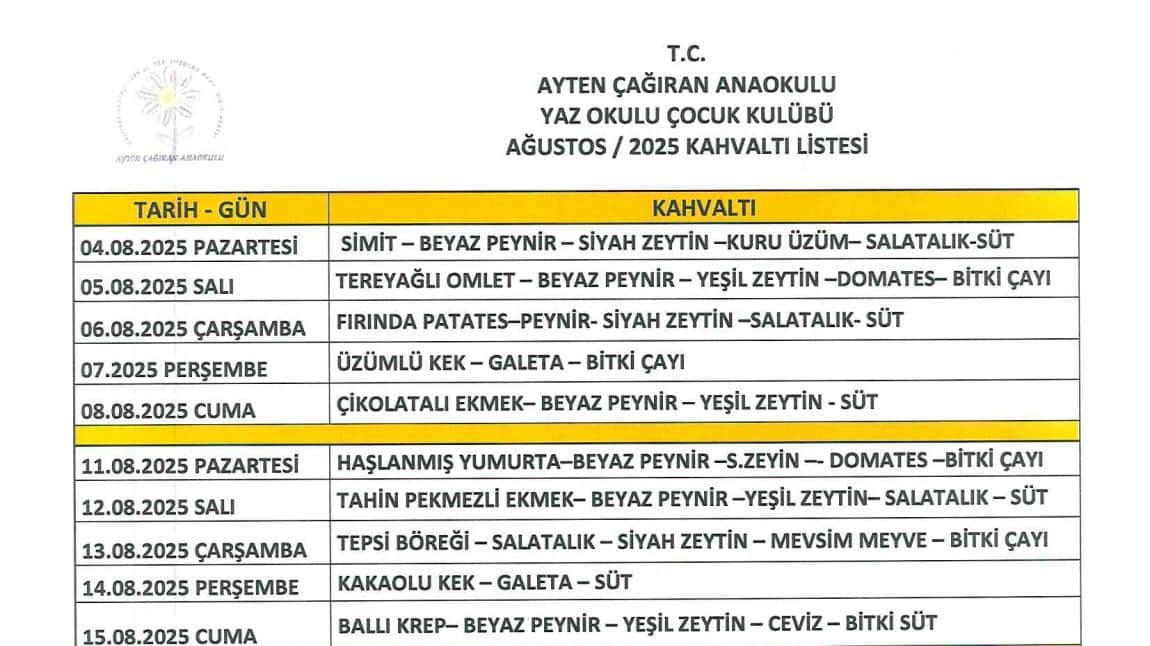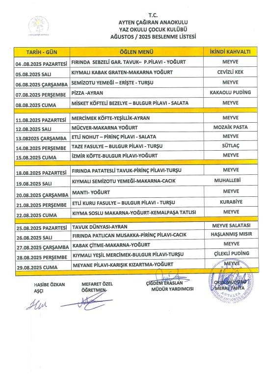 2025 AĞUSTOS AYI YAZ OKULU ÇOCUK KULÜBÜ KAHVALTI VE YEMEK MENÜLERİ